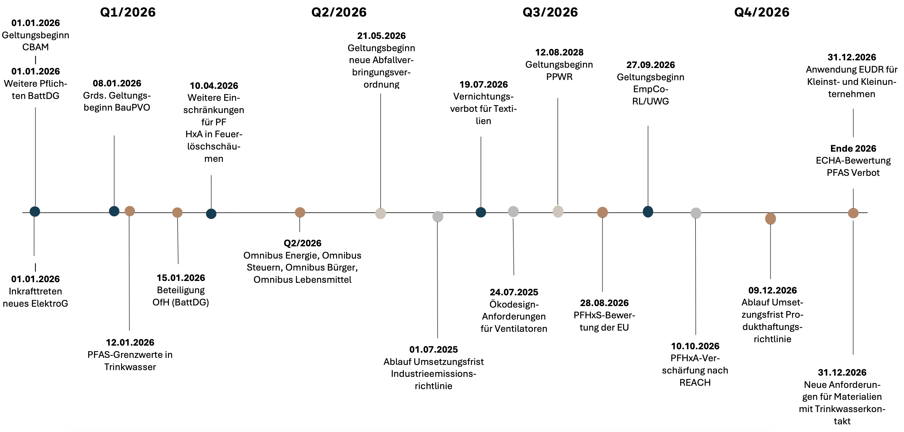 Zur besseren Übersicht haben wir der beigefügten Mandanteninformation einen Zeitstrahl vorangestellt, in dem einige der wichtigsten Rechtsänderungen im Umwelt-, Kreislaufwirtschafts- und Produktrecht für das Jahr 2026 abgebildet sind.
